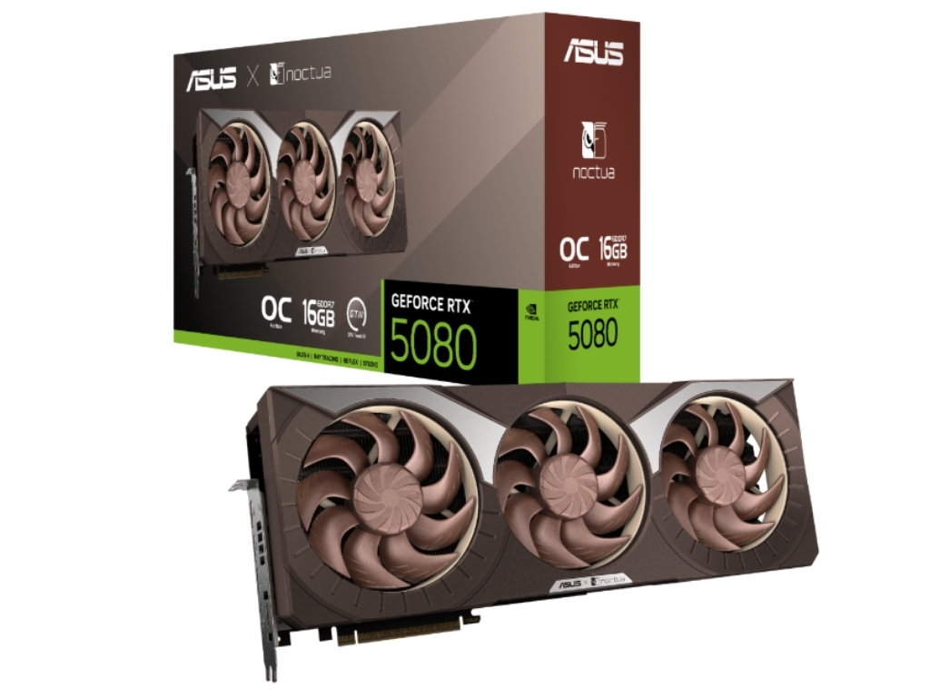 ASUS GeForce RTX 5080 Noctua Edition, üç adet Noctua NF-A12x25 G2 fan ile geliyor. Optimize edilmiş buhar odası ve geniş ısı kanatçıkları sayesinde kart ağır yük altında bile serin çalışabiliyor. Ayrıca ASUS’un 0 dB teknolojisi, sıcaklık düştüğünde fanların tamamen durmasını sağlıyor.