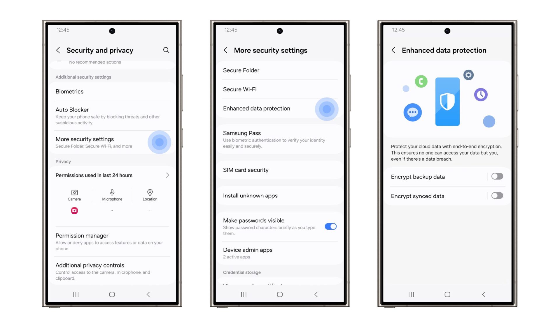 Samsung Galaxy S24 ile sunulan Gelişmiş Veri Koruması, verilerinizi uçtan uca şifreleme (E2EE) yöntemiyle güvence altına alıyor. Bu sayede verileriniz, yalnızca sizin cihazınızda şifreleniyor ve sadece siz çözebiliyorsunuz. Samsung Cloud ile senkronize edilen verileriniz, bir sunucu tehlikeye girse bile güvende kalıyor.